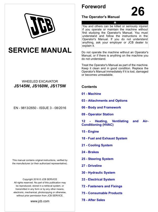 26 JCB JS145W, JS160W, JS175W Excavator Service Repair Manual 1807 pages