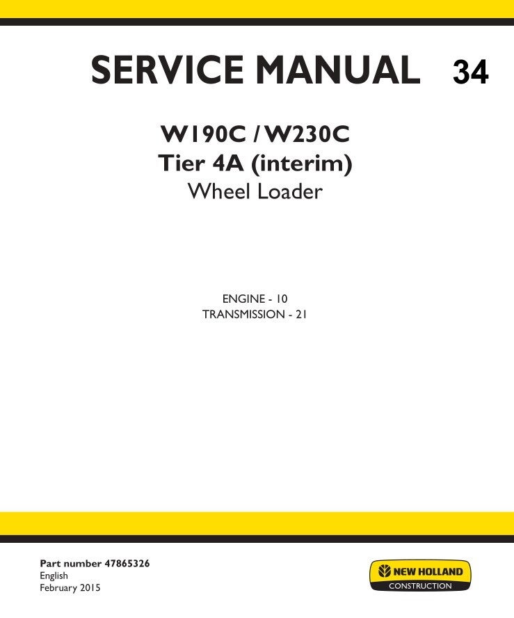 NHB 34 New Holland W190C, W230C Tier 4A (interim) Wheel Loader Service Manual 2 engine and transmission 342 pages