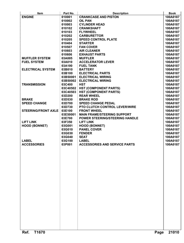 Kubota-Garden Tractor T1670 Parts Manual