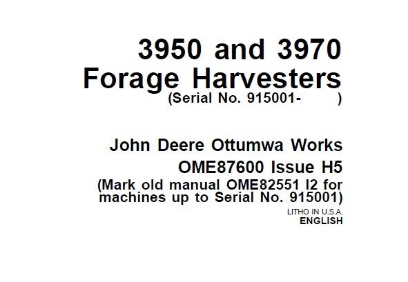 This manual contains information concerning the adjustment and maintenance of the John Deere 3950 and 3970 Forage Harvesters (Serial No. 915001- ).