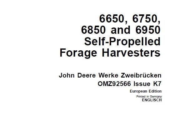 This manual contains information concerning the adjustment and maintenance of the John Deere 6650, 6750, 6850 and 6950 Self-Propelled Forage Harvesters.
